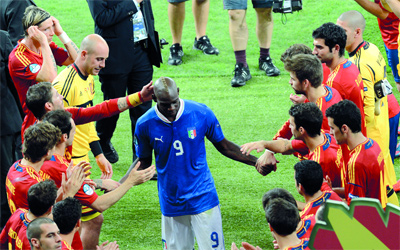 نجوم إسبانيا يواسون نجم إيطاليا بالوتيلي ورفاقـــــــــــــــــــــــــــــــــــه بروح رياضية خلال التتويج. أ.ف.ب
