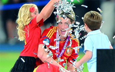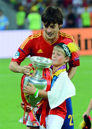 وتحول ملعب كييف في أوكرانيا إلى ساحة مدرسة، صال فيها الأطفال وجالوا برفقة آبائهم المنتشين فرحاً بالانتصار الكبير على ايطاليا، في المباراة النهائية برباعية نظيفة. وفي الصور يظهر اللاعبون: تشابي ألونسو برفقة زوجته وأطفاله، وتوريس يمرح مع صغاره بعد تتويجه بلقب هداف البطولة، وسيلفا أهدى الكأس إلى نجله، فيما احتفل سيرجيو راموس بصحبة ابنته.
