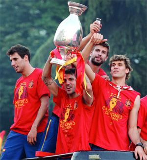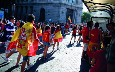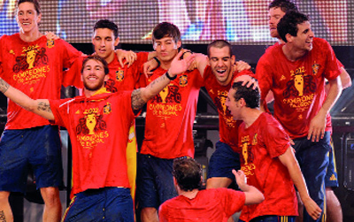 تجمع الآلاف من أنصار المنتخب الإسباني في الساحة العامة بالعاصمة الاسبانية مدريد، أول من أمس، للاحتفال بالإنجاز التاريخي الذي حققه منتخب الماتادور بعد الفوز بلقب البطولة الأوروبية الأخيرة في بولندا واوكرانيا عقب سحقه المنتخب الإيطالي في النهائي برباعية نظيفة.