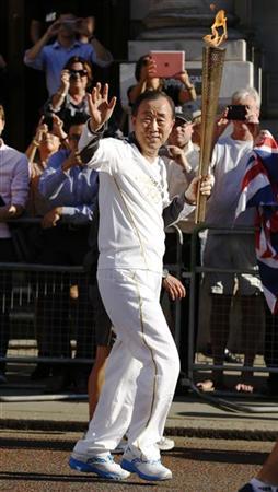 بان كي مون يحمل شعلة اولمبياد لندن 2012 في وسط العاصمة البريطانية لندن - رويترز