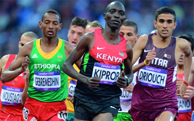 القطري حمزة دريوش (يمين) يزاحم العدائين في سباق 1500 متر. أ.ف.ب