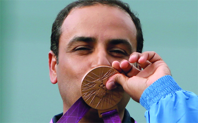الديحاني يُقبّل الميدالية البرونزية. أ.ف.ب