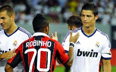 حقق ريال مدريد، بطل الدوري الإسباني لكرة القدم، فوزه الثالث على التوالي في جولته الأميركية الاستعدادية للموسم المقبل، بعدما اكتسح ميلان وصيف بطل ايطاليا 5-،1 في مباراة ودية اقيمت في نيويورك. وافتتح الأرجنتيني انخل دي ماريا التسجيل للفريق الملكي بطل دوري ابطال اوروبا تسع مرات من كرة طائرة (24)، وعادل البرازيلي روبينيو لميلان (33). وفي الشوط الثاني، ضرب ريال مدريد بقوة وأضاف البرتغالي كريستيانو رونالدو هدفين (49 و66)، ثم عزز سيرجيو راموس بالهدف الرابع من ضربة رأس اثر ركنية نفذها البرازيلي كاكا (81)، واختتم خوسيه كايخون المهرجان اثر تمريرة من كاكا ايضا (89).