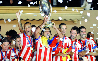 أحرز أتلتيكو مدريد الاسباني، بطل الدوري الاوروبي «يوروبا ليغ»، الكأس السوبر الاوروبية لكرة القدم اثر فوزه على تشلسي الانجليزي، بطل مسابقة دوري ابطال أوروبا، 4-1 أول من امس في موناكو. وسجل الكولومبي رادامل فالكاو (6 و19 و45) والبرازيلي جواو ميراندا دا سيلفا (60) اهداف اتلتيكو مدريد، وغاري كاهيل (75) هدف تشلسي. واللقب هو الثاني لأتلتيكو مدريد بعد 2010 بفوزه على انتر ميلان الايطالي (2-صفر)، فيما فشل تشلسي في إحراز اللقب الثاني في المسابقة بعد الاول عام 1998 حين كان بطلاً لكأس الكؤوس التي ألغيت لاحقا، على حساب ريال مدريد الاسباني. واستضاف ملعب لويس الثاني للمرة الـ15 الاخيرة المباراة التي تجمع سنويا بين حامل لقب دوري ابطال اوروبا وبطل مسابقة الدوري الاوروبي، حيث تقرر ان تقام بالمداورة بين الدول الـ53 الاعضاء في الاتحاد الاوروبي على ان تستضيف براغ نسخة .2013