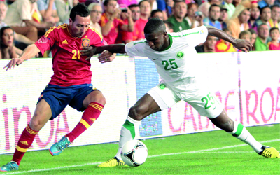 لاعب منتخب السعودية البيشي مع الإسباني كازولا. افي
