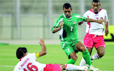 لاعب العراق عماد محمد محاصر من فيصل إبراهيم وعامر ذيب في مباراة سابقة. أرشيفية - ا.ف.ب