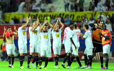 فرحة لاعبي إشبيلية بالفوز. أ.ف.ب