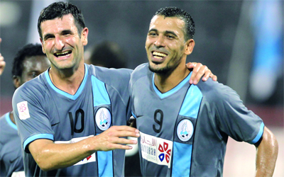 يونس محمود (يمين) والفرنسي بيير بعد الهدف الثاني. أ.ف.ب