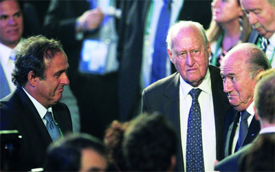 بلاتيني (يسار) في حوار سابق مع بلاتر. أ.ف.ب