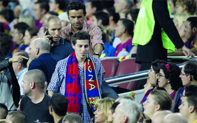 الجندي الإسرائيلي السابق جلعاد شاليط على مدرجات «كامب نو» وســــــــــــــــــــــــــــــــــط حراسة مشددة. أ.ف.ب