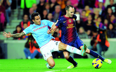 إنييستا يشن هجمة صوب مرمى سلتا فيغو. أ.ف.ب
