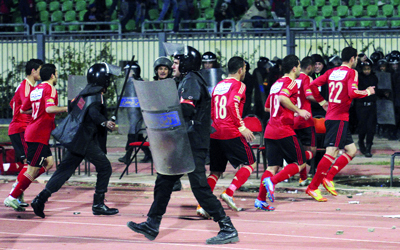 لاعبو الأهلي يهرعون هرباً من شغب الجمهور في ملعب بورسعيد. أ.ف.ب