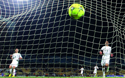 الجزائريان رفيق حليش وجمال مصباح يراقبان كرة توغو معانقة للشباك. أ.ب