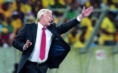 مدرب جنوب إفريقيا يوجه لاعبيه خلال المباراة. أ.ب
