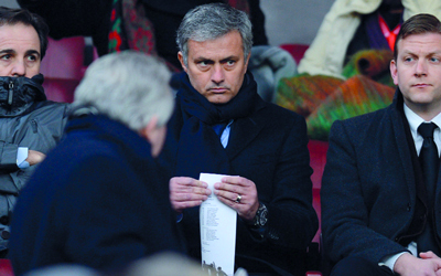 مورينيو خلال حضوره مباراة خصمه مانشستر يونايتد ضد ايفرتون. أ.ف.ب