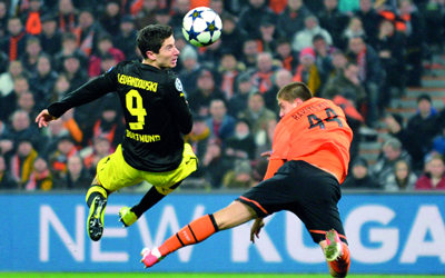 حذا بوروسيا دورتموند الألماني حذو مانشستر يونايتد وقطع شوطاً مهماً نحو بلوغ ربع النهائي للمرة الاولى منذ موسم 1997-1998، حين كان يدافع عن لقبه، وذلك بعودته من ملعب «دونباس ارينا» الخاص بمضيفه شاختار دانييتسك الاوكراني، بالتعادل 2-2، امام 52 ألف متفرج. وسجل الكرواتي داريو سرنا (31)، والبرازيلي دوغلاس كوستا (68)، هدفي شاختار، والبولندي روبرت ليفاندوفسكي (41)، وماتس هوملز (87) هدف بوروسيا دورتموند. وكان شاختار الطرف الافضل في معظم فترات اللقاء، وكان الأجدر بالفوز. وبدأ صاحب الارض اللقاء بهجوم ضاغط، لكن الخطورة أتت لأول مرة من جانب بوروسيا دورتموند الذي حصل على ركنية نفذها ليفاندوفسكي وتابعها هوملز برأسه قوية، فارتدت الكرة من العارضة وشتتها الدفاع (17)، تبادل بعدها الفريقان السيطرة على المجريات. وأرسل البرازيلي اليكس تيكسييرا كرة من ركلة حرة احدثت خطورة قبل ان ترتد إليه تابعها عرضية عالية لم تستغل (23)، وأطلق البرازيلي فرنادينيو بقوة كرة مرتدة من الدفاع علت مرمى الحارس الالماني رومان فايدنفيلر (28)، وحصل البرازيلي لويز ادريانو على ركلة حرة نفذها الكرواتي المخضرم قائد شاختار بإحكام ووضع الكرة في قلب المرمى مفتتحاً التسجيل (31).