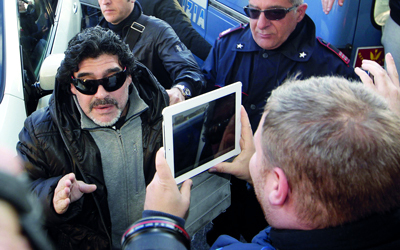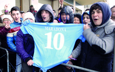 وصل الأسطورة الأرجنتينية دييغو مارادونا إلى إيطاليا، أول من أمس، قادما من دبي، لمناقشة مشكلته مع مصلحة الضرائب هناك. وحظي مارادونا بترحيب الجماهير الإيطالية، خصوصاً من جانب أنصار نادي نابولي، الذي حقق معه الأسطورة إنجازات لن تمحى من ذاكرة الكرة العالمية.