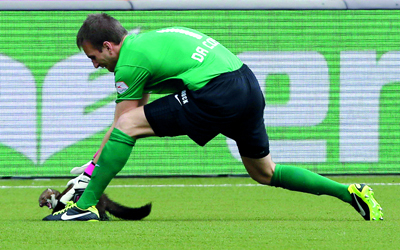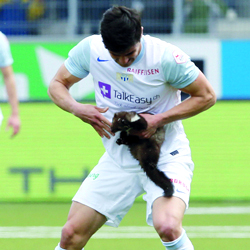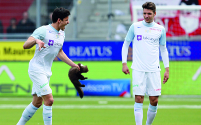 نزل حيوان بري صغير يشبه السنجاب أرض الملعب وعض لاعباً حاول الإمساك به خلال مباراة في دوري سويسرا لكرة القدم، بين تون وزيوريخ، أول من أمس. وبعد ذلك نجح لاعب آخر في الامساك به، وسلمه لمسؤولي الاستاد.