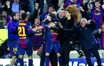 إحدى المشجعات تحاول الاشتراك في فرحة برشلونة بالفوز الكبير على ميلان. إي.بي.إيه