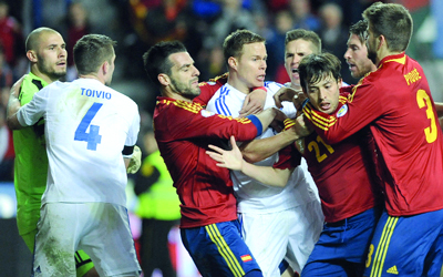 شهدت مباراة المنتخبين الإسباني والفنلندي التي انتهت بالتعادل 1-1 في تصفيات أمم أوروبا لكرة القدم، أول من أمس، عراكاً بين لاعبي الطرفين خلال الدقائق الأخيرة، في ظل العصبية الزائدة واستعجال الهدف من جانب لاعبي الماتادور.
