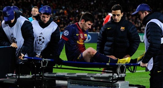 أصيب ليونيل ميسي مهاجم برشلونة في عضلات الفخذ الخلفية، ومني خافيير ماسكيرانو بإصابة أكثر خطورة في الركبة خلال التعادل 2-2 مع باريس سان جيرمان في ذهاب دور الثمانية لدوري أبطال أوروبا لكرة القدم أمس.