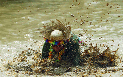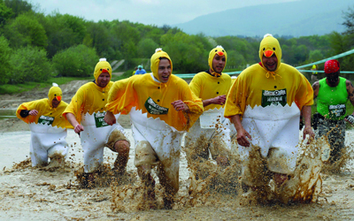 شهدت مدينة بيير السويسرية، أمس، تنظيم ما يطلق عليه «عدو بارجوت»، ويعني «العدو المجنون»، إذ يقوم المشاركون وعددهم 700 بارتداء ألبسة تقليدية وأشياء خاصة بكل فريق، ويقطعون طريقاً تمتاز بالعديد من المطبات بينها برك من الوحل، وتنقسم بحسب المسافة، فهناك الطريق الأصغر، ويصل طولها إلى 5 كلم ثم طريق أخرى لمسافة 10 كلم.