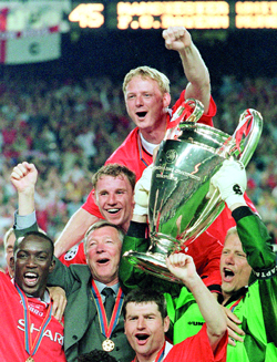 فيرغوسون يحتفل مع فريقه بلقب الأبطال سنة 1999. أ.ب