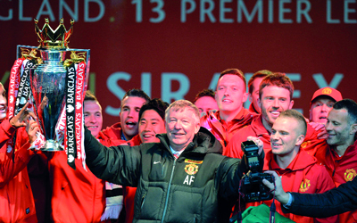 فيرغوسون خلال الاحتفال مع لاعبي مانشستر بلقب الدوري الإنـجليزي. أ.ف.ب