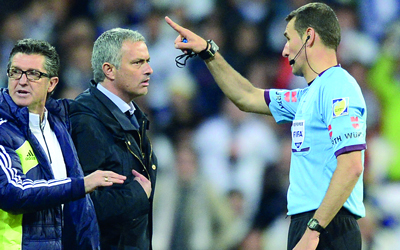 الحكم يطرد مورينيو من الملعب لكثرة اعتراضاته على قرارات التحكيم. أ.ف.ب