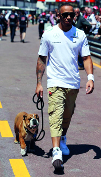 وتعد ظاهرة اصطحاب الكلاب إلى عالم سباقات الفورمولا1 جديدة على المتسابقين وجماهير البطولة، إلا أن تعلق السائق البريطاني بكلبه لم يقف عند حد اصطحابه لجولات البطولة فحسب، بل حتى في جعله يتجول إلى جانبه على مضامير تلك الحلبات، ومنها ما قام به يوم الأربعاء الماضي المخصص لجعل السائقين يسيرون على الحلبة للتعرف إليها حين قام هاملتون باصطحاب كلبه، ومن ثم التوقيع إلى مشجعيه والكلب برفقته.