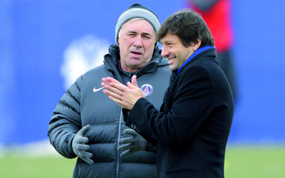 ليوناردو وإنشلوتي خلال تدريبات باريس سان جيرمان. رويترز