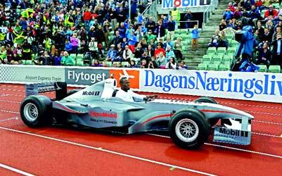 بولت دخل إلى المضمار بسيارة الفورمولا ضمن مشاركته في حملة إعلانية. أ.ف.ب