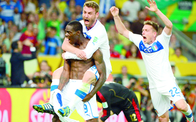 بالوتيللي يستعرض عضلاته بعد تسجيل هدف الفوز لإيطاليا. أ.ف.ب