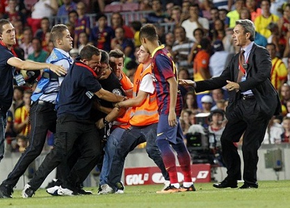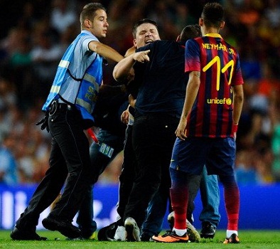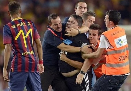 تناقلت مواقع التواصل الاجتماعي صورا لمشجع غاضب قام باقتحام الملعب أثناء مباراة بين فريقي برشلونة وسانتوس، ليتهجم على اللاعب نيمار، حيث قام بمهاجمته بصورة وحشية، لولا تدخل رجال الأمن وحكم الملعب وعدد من اللاعبين لإبعاده.