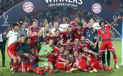 لاعبو بايرن ميونيخ يحتفلون بلقب الكأس السوبر الأوروبية. رويترز