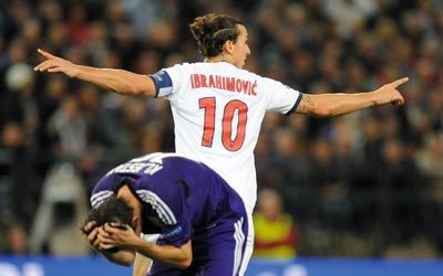 إبراهيموفيتش يحتفل بأهدافه الاستعراضية والحزن يخيّم على لاعبي أندرلخت. أ.ف.ب