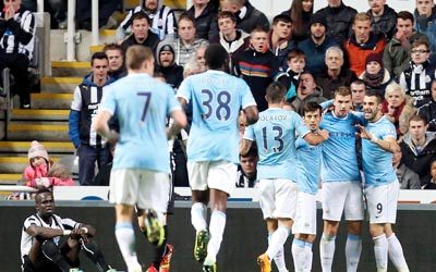 لاعبو سيتي يحتفلون بالتأهل على حساب نيوكاسل. أ.ف.ب