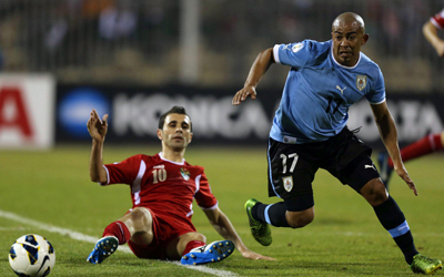 أحرزت أوروغواي بخبرة نجومها الكبار فوزاً عريضاً قوامه خمسة أهداف نظيفة في دار «النشامى»، بعد تغلبها على الأردن في المباراة التي جمعت المنتخبين مساء أمس على ملعب عمان الدولي، في ذهاب الملحق العالمي للتصفيات المؤهلة إلى كأس العالم في البرازيل 2014، ليضع «السليستي» قدماً في بلاد السامبا، إذ يلتقي المنتخبان مجدداً في لقاء الإياب الأسبوع المقبل في العاصمة الأوروغويانية مونتديفديو في 19 الجاري.