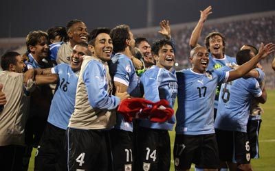 فرحة كبـيرة للاعبي أوروغواي بعد حسم التأهل بشكل كبـير إلى البرازيل. رويترز