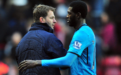 شيروود يهنئ لاعبه أديبايور بعد الفوز على ساوثمبتون. أ.ف.ب