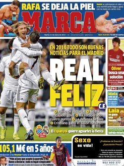 نشرت صحيفة ماركا الإسبانية في عددها الصادر أمس، تقريراً تناول الإيجابيات التي حصدها نادي ريال مدريد مع حلول عام 2014، وعنونت غلافها: «كل الأخبار جيدة لريال مدريد في 2014»، وقالت إن «الريال سعيد.. سجله مثالي، فقد تخلص من فارق أربع نقاط وكريستيانو توج بالكرة الذهبية».