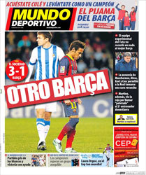 عنونت صحيفة «الموندو ديبورتيفو» الإسبانية غلافها أمس، بعد خسارة برشلونة غير المتوقعة أمام ريال سوسييداد 1-3 في الأسبوع 25 من الليغا: «أنويتا.. على الطريق مرة أخرى»، في إشارة لعقدة برشلونة على هذا الملعب وغياب الفوز منذ أربعة أعوام، وتغنت الصحيفة بنتائج النادي الكتالوني في عهد المدرب الهولندي السابق فرانك ريكارد.