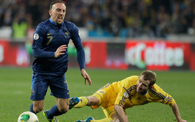 من لقاء سابق بين منتخب أوكرانيا وفرنسا في تصفيات مونديال 2014. أ.ب