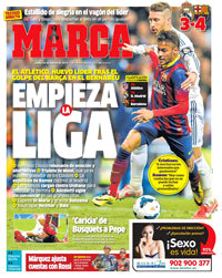 عنونت صحيفة «ماركا» الإسبانية غلافها في عددها الصادر أمس: «الدوري بدأ من جديد»، وقالت إن «الكلاسيكو كان رائعاً وممتلئاً بالعاطفة.. ميسي سجل ثلاثية وأصبح هداف مباريات الكلاسيكو بالفعل». وأضافت أن «لاعبو ريال مدريد يبررون الهزيمة بسبب أداء الحكم أونديانو الهزيل». وتابعت « أنشيلوتي لا يزال مقتنع بتحقيق اللقب ودي ماريا يظهر بأداء مبهر وبنزيما كبير».