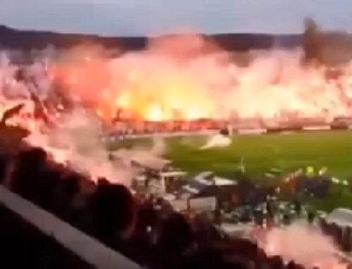 وغاب مشهد اللاعبين والجمهور وسط كومة النيران التي امتدت إلى باقي مدرجات الملعب.