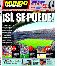 عنونت صحيفة «موندو ديبورتيفو» الموالية للنادي الكاتالوني غلافها، أمس: «نعم.. بإمكاننا»، موضحة أن المباراة الأخيرة في الدوري أمام أتلتيكو مدريد بحاجة إلى تضحيات من أجل الفوز باللقب. وأضافت أن «بارتوميو والمدرب تاتا يدعوان أنصار الفريق إلى دعم النادي بعد التعادل في ايلشي».