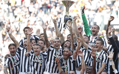 نجوم يوفنتوس متوجين بلقب الدوري الإيطالي. أ.ف.ب