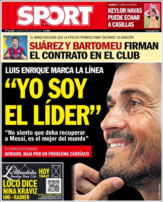 وصف مدرب فريق برشلونة لويس انريكي نفسه بـ«القائد الفعلي» والرجل الأهم في فريق برشلونة بحسب الحديث الذي نشرته صحيفة «سبورت»، التي قالت إن انريكي أصر على انه يتمتع بكل الإمكانات التي تؤهله لقيادة لاعبيه الموسم المقبل، مشيراً إلى أن ميسي ليس في حاجة إلى تأهيل.