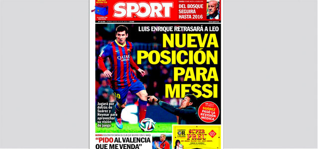نقلت صحيفة «سبورت» الإسبانية، أمس، عن مدرب برشلونة لويس أنريكي، قوله إن مركزاً جديداً ينتظر ميسي في برشلونة الموسم المقبل، حيث سيكون حلقة الوصل بين النجمين نيمار وسواريز، وذكرت الصحيفة أن أنريكي يسعى لإحداث تغيير مهم على طريقة لعب برشلونة، من دون الإخلال بنظام لعبه المعتاد منذ سنوات.