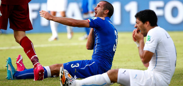 سواريز عض كتف كيليني خلال مباراة إيطاليا وأوروغواي في المونديال. أ.ف.ب